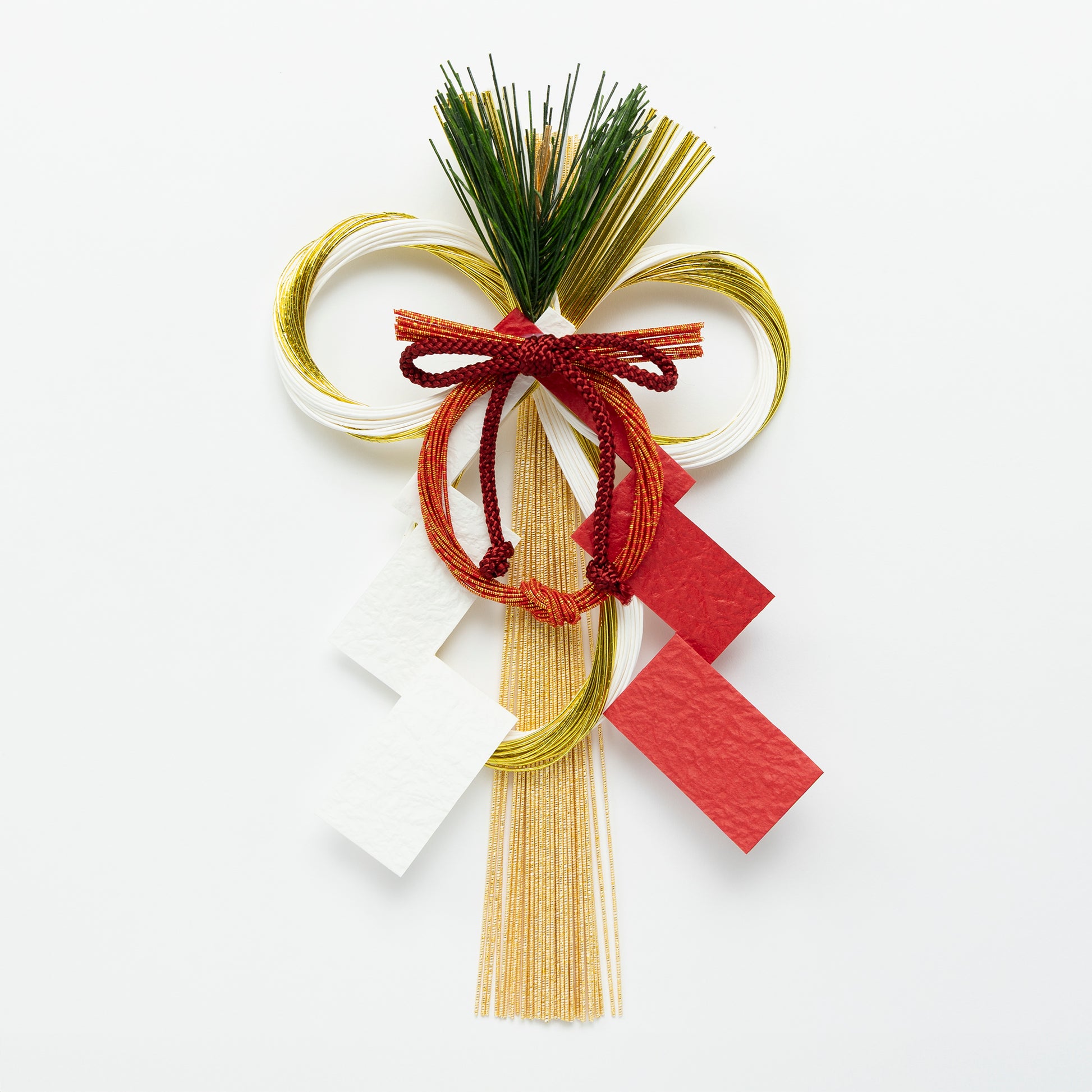 職人が1つ1つ手作りした国産のお飾りです。縁起のよい紅白金の水引蝶結びに、神様を「待つ」とされる松と、清浄さを表す紙垂で飾り付けています。