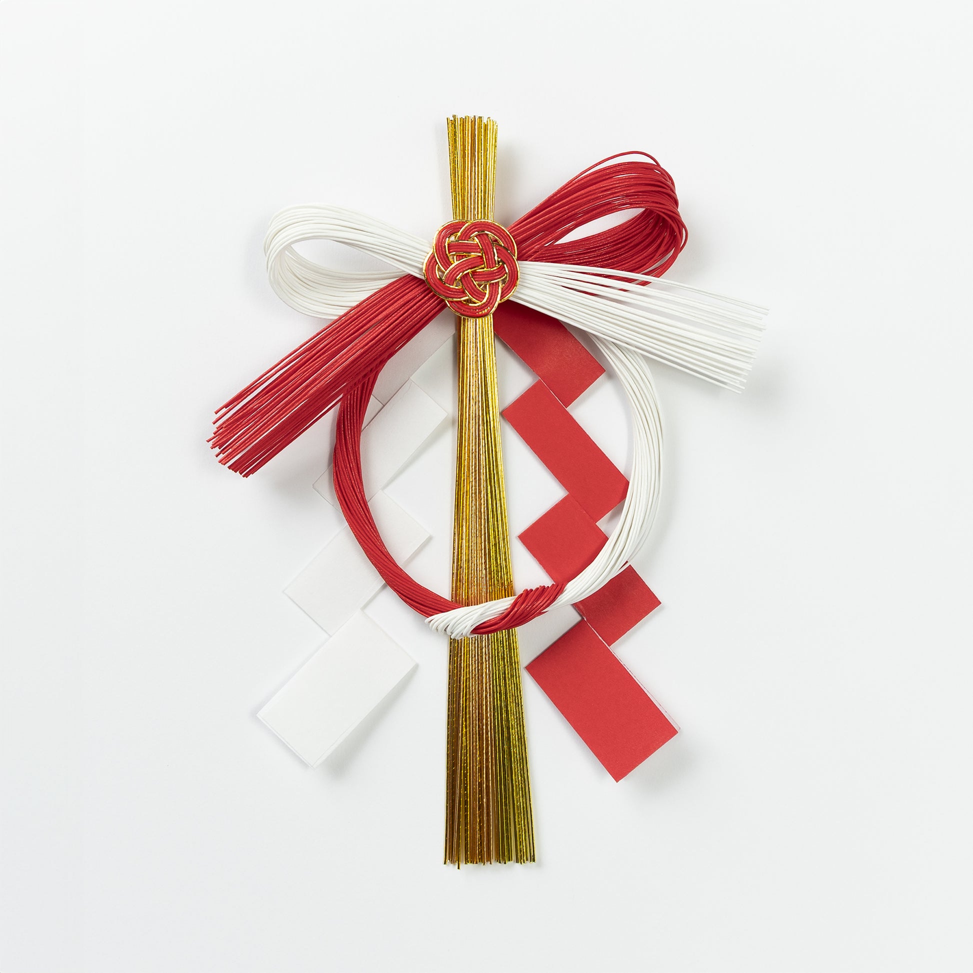 職人が1つ1つ手作りした国産のお飾りです。華やかな紅白金の水引蝶結びに、縁起のよい梅あわじの水引飾りが付いています。