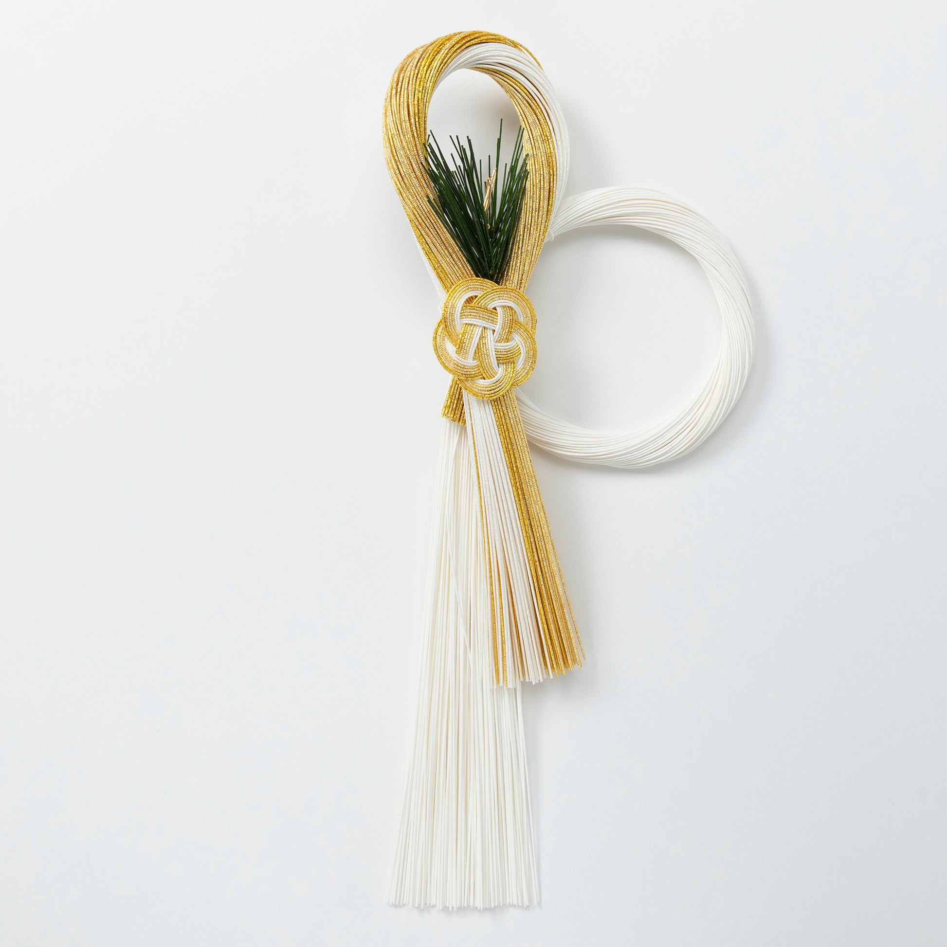職人が1つ1つ手作りした国産のお飾りです。縁起のよい梅あわじの水引飾りが付き、金白のシンプルなデザインでさまざまな玄関のドアやインテリアに馴染みます。
