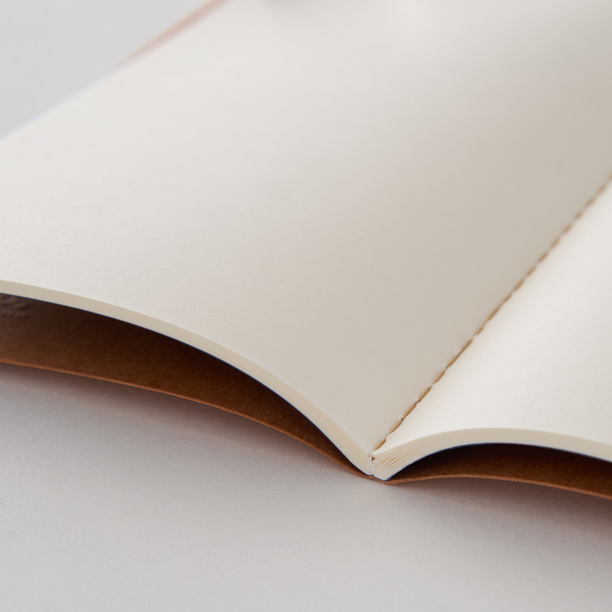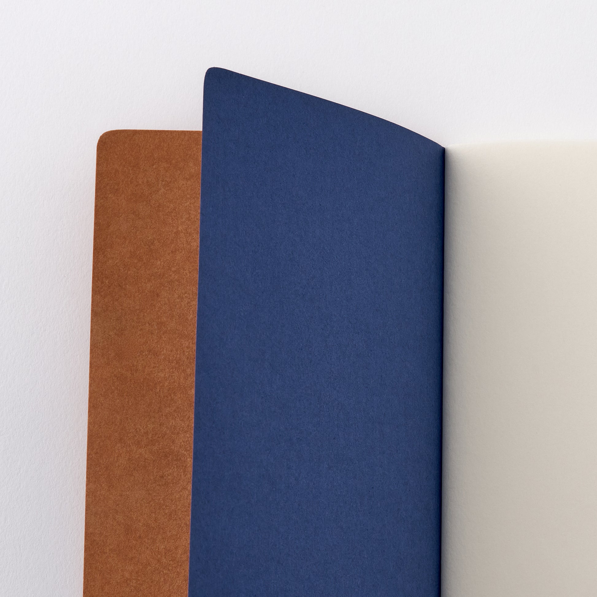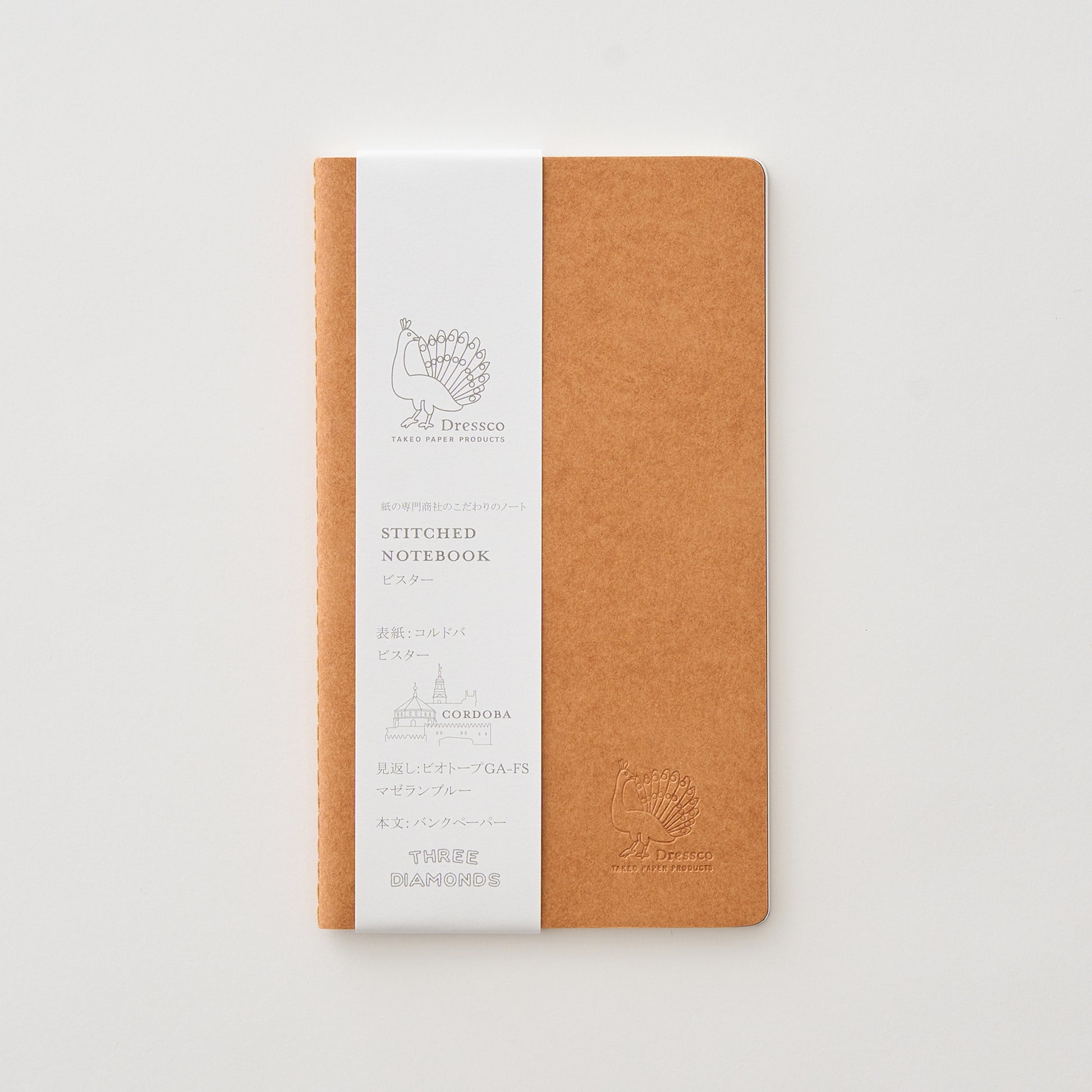 ミシン製本でつくられた、携帯に便利な手のひらサイズのノート。本文はペン走りが滑らかで、緻密で張りのある平滑なステーショナリー用紙、バンクペーパーです。この紙は裏抜けに強く万年筆にも向いています。「THREE DIAMONDS」の透かし模様入りです。表紙は革のような独特のぬめり感としなやかさを追求した紙、コルドバ ビスター。見返しは、深みのある色合いと張りのある触感が特徴のクラフト素材の紙、ビオトープGA-FS マゼランブルーです。