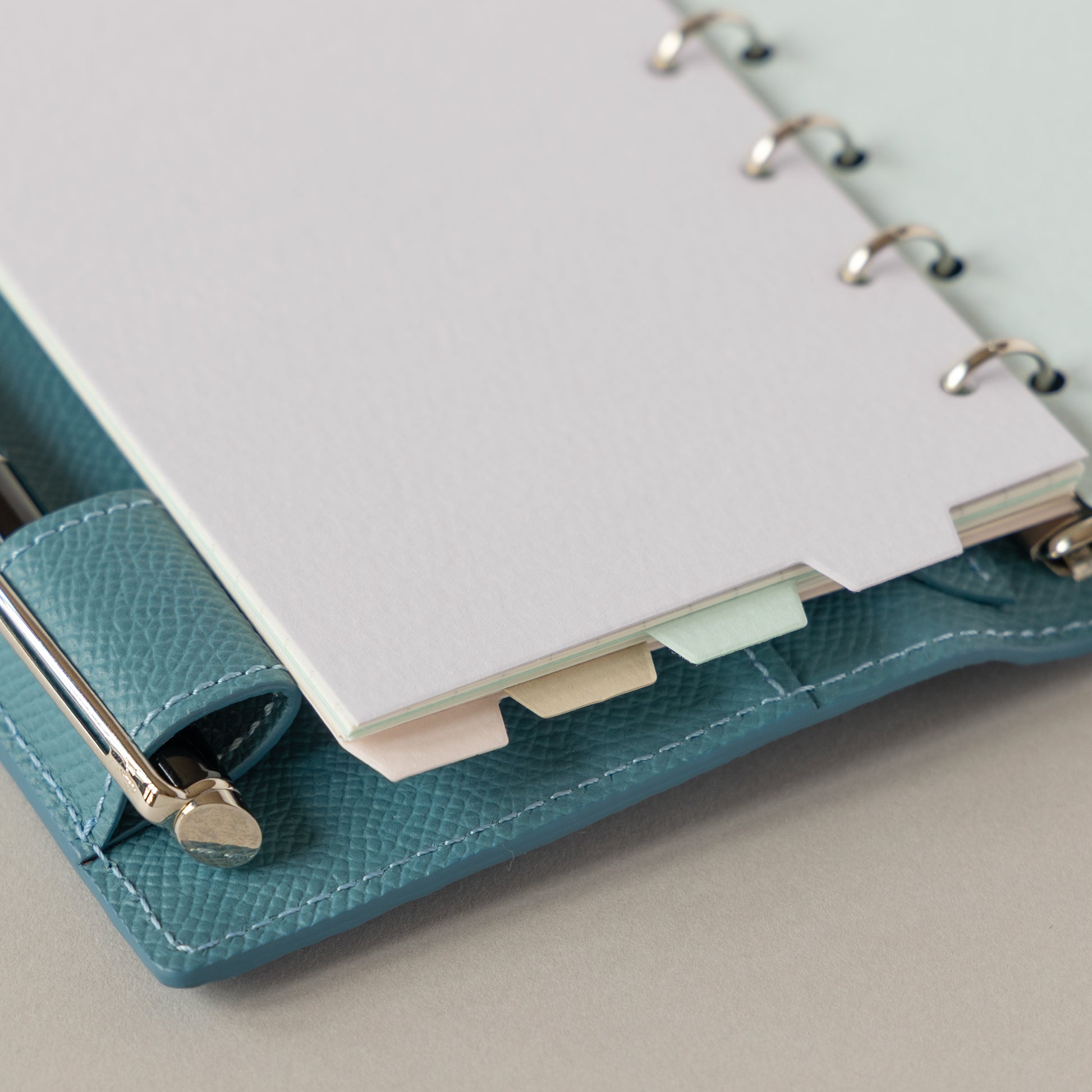 さざ波のようなフェルトマーク(穏やかな凹凸)が特徴の紙、マーメイド-FSを使用したインデックス。パウダーブルー、レースラベンダー、みずいろ、エクリュ、ペタルピンクの5色です。ペンホルダーに当たらず、書きこめるトップ5段タイプ。