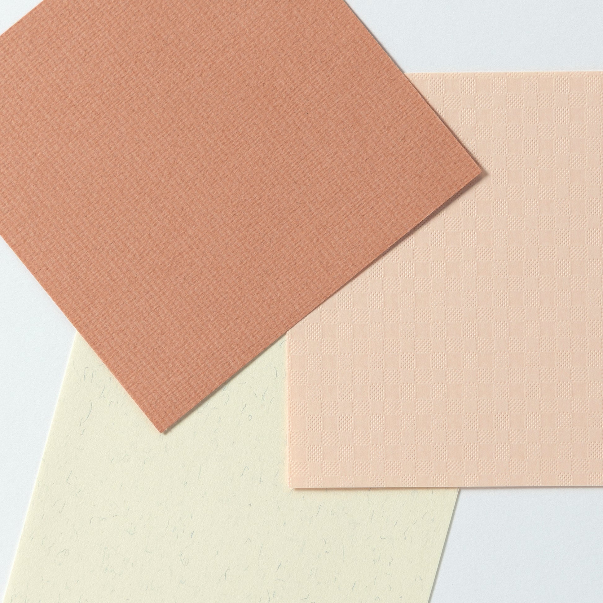 細かな染色繊維がブレンドされた、横方向のレイド(簀の目模様)と縦方向のフェルト調の模様が特徴的な紙。
